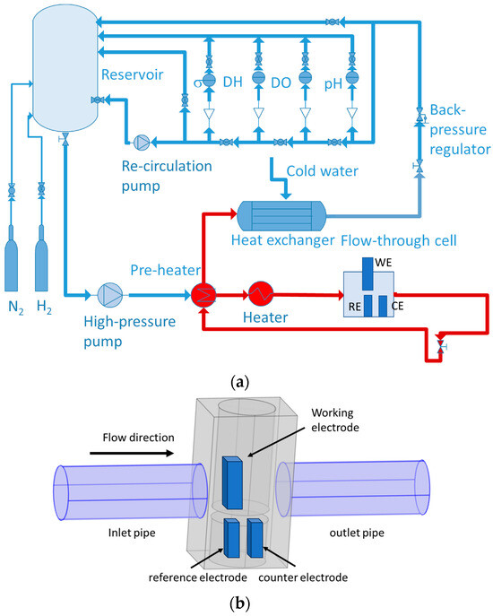Figure 1. Re-circulation loop (a) with a flow-through cell (b). WE-working electrode (AISI 316L), RE—reference electrode, CE—counter electrode.