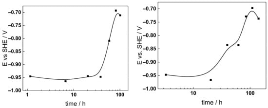 Figure 2. Corrosion potential vs. time during exposure of AISI 316L to 3 (left) and 6 mg kg−1 KOH (right) at 280 °C.