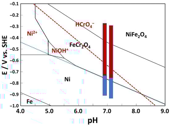 The values of the OCP after 168 h of exposure, as shown in an E-pH diagram of Fe-Cr-Ni-H2O at 280 °C/9 MPa (Figure 3), indicate that the stable corrosion product was probably chromite (FeCr2O4) with some incorporated Ni (0), as observed for similar steels in the pressurized water reactor B-K-Li primary chemistry [16]. Several recent works support the predictions of the E-pH diagram using SEM/EDS and TEM characterization of PWR oxides on 316L featuring an inner layer with a composition close to (Fe, Ni)Cr2O4 and an outer layer composition close to NiFe2O4 [18,19,20,21,22].