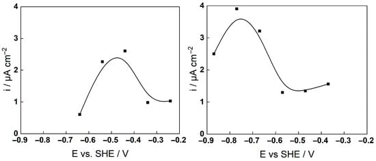 Figure 4. Current-potential curves during anodic polarization of AISI 316L after 140 h exposure to 3 (left) and 6 mg kg−1 KOH (right) at 280 °C.