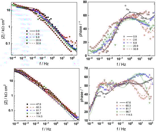 Figure 5, Figure 6, Figure 7 and Figure 8 show the electrochemical impedance spectra during both OCP exposure and anodic polarization in the studied primary coolants. Preliminary analysis of the spectra revealed that the impedance magnitude at f→0 (|Z|f=0, associated with the polarization resistance, i.e., the inverse of the corrosion rate) increased slowly over time and stabilized at 60–70 h in low-K and at 40–50 h in high-K chemistry. This increase is associated with the growth of the passive oxide. For longer durations, a small decrease of |Z|f→0 was usually observed, followed by a final stabilization at 140 ± 5 h.