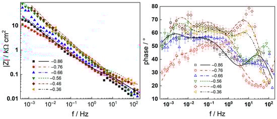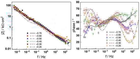Figure 8. Electrochemical impedance spectra of AISI 316L in 6 mg kg−1 KOH at 280 °C during anodic polarization at different potentials (V). Left column—impedance magnitude vs. frequency, right column—phase shift vs. frequency. Error bars in the phase angle plots show the reproducibility of the measurements at each potential. Points—experimental values, lines—best-fit calculation with the transfer function described in the text.
