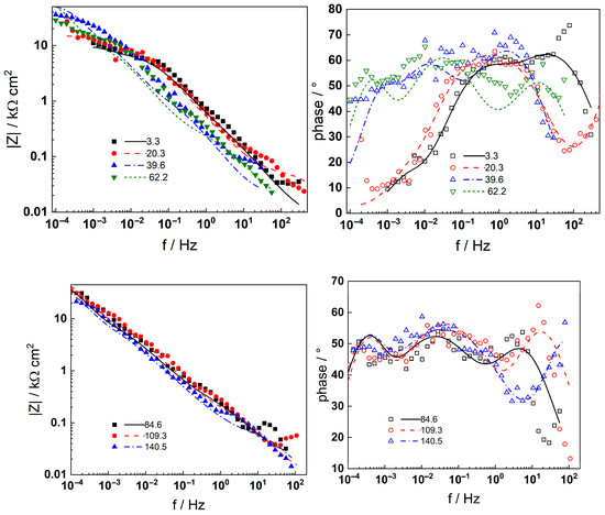 Figure 7. Electrochemical impedance spectra of AISI 316L in 6 mg kg−1 KOH at 280 °C during different times of exposure (h) at the open circuit potential. Left column—impedance magnitude vs. frequency, right column—phase shift vs. frequency. Points—experimental values, lines—best-fit calculation with the transfer function described in the text.