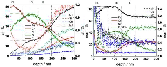 Figure 9 and Figure 10 illustrate the GDOES depth profiles of the oxides after 168 h of exposure to the respective chemistries. Both atomic concentrations and normalized cation contents vs. depth are presented.