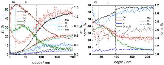 Figure 10. GDOES depth profiles of oxide film on AISI 316L after exposure to 6 mg kg−1 KOH at 280 °C for 168 h. (Left) atomic concentration vs. depth, (right) concentration of metallic constituents normalized to total metal concentration (atomic concentration of O shown for comparison). CL-contamination layer, IL—inner layer. Sigmoidal fits of the O and Fe profiles (left) shown with short-dashed lines.