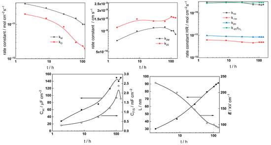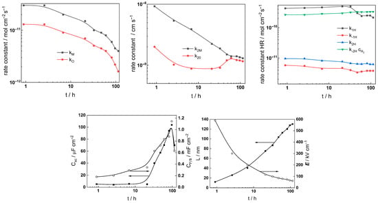• The rate constants of both oxide formation (kO) and metal oxidation (kM) decreased with exposure duration, which reflected the effect of increasing oxide thickness, according to the first two equations in (2). The respective rate constants of the filling of oxygen vacancies (k2O) and the ejection of interstitial cations (k1M) at the outer interface decreased with time in the low-K regime and were quasi-independent of time in the high-K regime. This indicated no significant evolution of the kinetics at that interface, i.e., once again, more efficient passivation in the high-K solution. It is important to mention that the steady-state values of the rate constants were comparable to those we estimated earlier in B-K-Li chemistry pertinent to the middle and end of a respective power cycle [16].