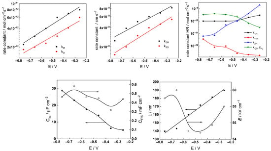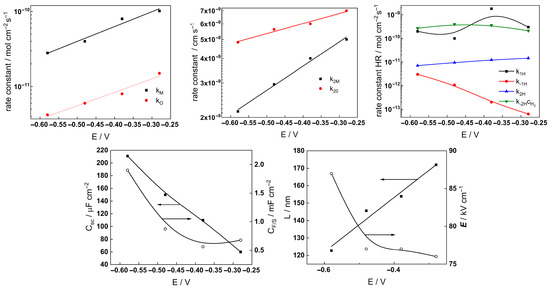 Complex non-linear least-squares fitting of the impedance data to the transfer function was used to obtain estimates of the kinetic and transport parameters. To decrease the number of free parameters, all the transfer coefficients of the steps involved in the hydrogen reaction were assumed to be equal to 0.5. The ability of the model to reproduce the impedance response for all the studied conditions is illustrated in Figure 5, Figure 6, Figure 7 and Figure 8 with solid lines. The dependencies of kinetic and transport parameters on time and potential are presented in Figure 12, Figure 13, Figure 14 and Figure 15 as a function of coolant chemistry. The values of parameters that are independent of time and/or potential are presented in Table 2.