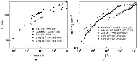 Figure 16. Comparison of oxide thickness—time (a) and corrosion release—time curves (b) estimated from the present data at the two KOH concentration levels to experimental data for compatible steels in WWER and PWR primary coolants. Adapted from refs. [21,22,23,24].