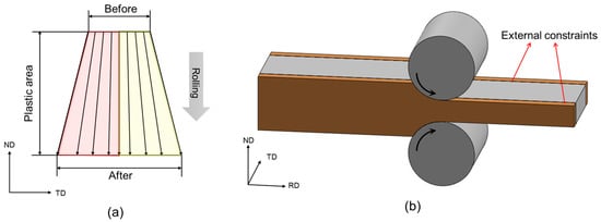 (a) Rolling model, where the area of external constraints represents the fixed nodes on the outer surface along TD. (b) Schematic diagram of the width spread during rolling.