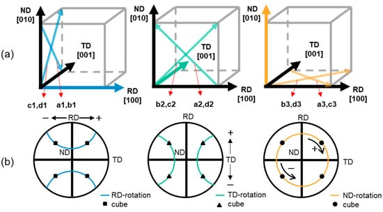 (a) Crystal coordinates relative to the sample coordinates of Cube orientation and the effects of slip system activation on crystal orientation. (b) The {1 1 1} pole figure shows the RD rotation, TD rotation, and ND rotation, respectively.