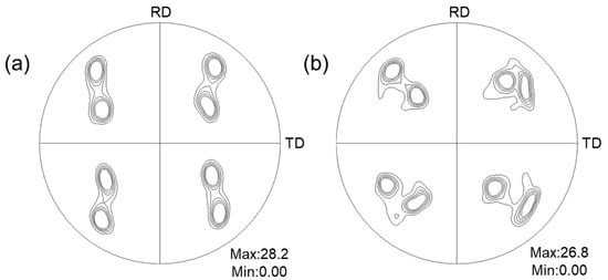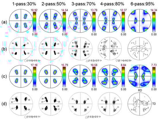 As illustrated in Figure 3c,d, at up to 50% reduction, the crystal orientations are primarily distributed around the initial orientations in 3DRC model. After 70% reduction, the orientation begins to deviate from the initial state, and asymmetric phenomena are observed in the experiment. After further reduction from 80% to 95%, the pole figures exhibit a pattern similar to the 70% reduction. The primary orientations are concentrated near the {1 0 2} <2 0 1> orientation, with dispersion along the TD axis, and they present a homogeneous texture after 95% reduction.