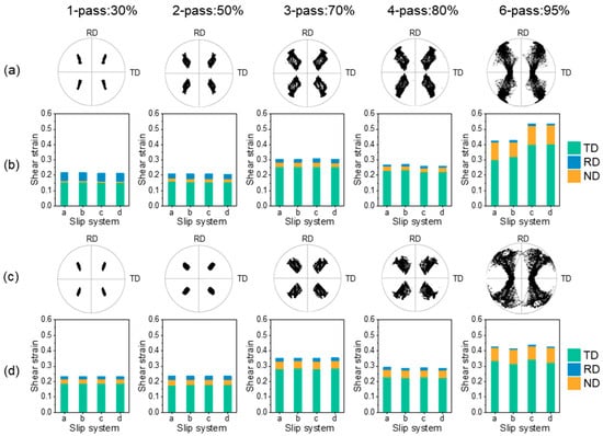 To better understand the underlying deformation mechanisms behind the observed texture evolution, the shear strain on the active slip systems was further examined, as illustrated in Figure 4. It was observed that TD rotation was dominant across all reductions, while non-TD rotation gradually developed as the reduction increased, which is consistent with findings reported in Ref. []. Although both 3DR and 3DRC exhibit similar rotation patterns, the presence of external constraints in the 3DRC results in distinct variations in non-TD rotation. At 30% reduction, shear strain acting on RD exceeds that on ND in 3DR, whereas this trend is reversed in 3DRC. After 50% reduction, TD is the dominant rotation in both 3DR and 3DRC. Additionally, RD remains secondary in 3DR, while ND is secondary in 3DRC, indicating that the rotation path is unchanged after 2-pass. As reduction reaches 70%, TD rotation remains dominant in 3DR, leading to a more dispersed orientation distribution. In contrast, in the 3DRC model, non-TD rotation becomes comparable to TD rotation, resulting in a more concentrated orientation distribution. At this stage, the differences between 3DR and 3DRC become more pronounced. In 3DR, crystal rotation spreads along both TD and RD, whereas in 3DRC, rotation is primarily distributed along TD and ND. Additionally, although RD remains the secondary rotation axis in 3DR, the shear strain acting on ND gradually increases. In contrast, the shear strain in 3DRC does not display significant changes. After 80% reduction, the shear strain acting on ND continues to increase in 3DR, and crystal rotation begins to exhibit ND rotation, while the 3DRC maintains its previous rotation path. This trend continues up to 95% reduction. Although the rolling conditions are identical in the simulation, differences in the shear strain acting on the slip system and crystal orientation rotation angles indicate that the initially formed texture affects the evolution of subsequent textures. This phenomenon has been observed in many experiments [,,,].