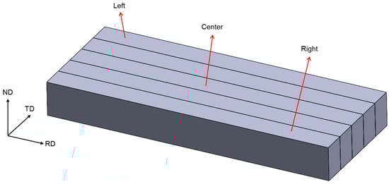 According to the strain field in the rolling gap, the uneven deformation in the rolling bite leads to the shear strain gradient along the ND [,,,]. During rolling, the shear strain along the ND results from surface friction (Fshear) and rolling bite geometry (Gshear) []. Gshear is related to the roll diameter, initial sample thickness, and reduction []. In the upper half of the sample, Fshear follows a nonlinear trend, while Gshear follows a linear form, both increasing from zero at mid-thickness to a maximum at the surface [,]. The lower half of the sample exhibits the opposite. According to the observation in Ref. [], the Gshear primarily acts on the middle region, while Fshear is primarily dominant in the surface region. Thus, the shear strain varies along the ND, which leads to the inhomogeneous texture distribution [].