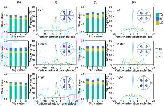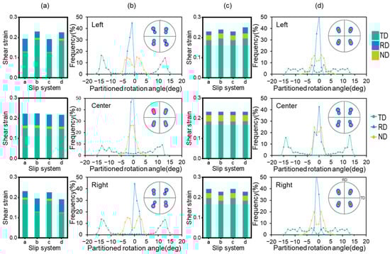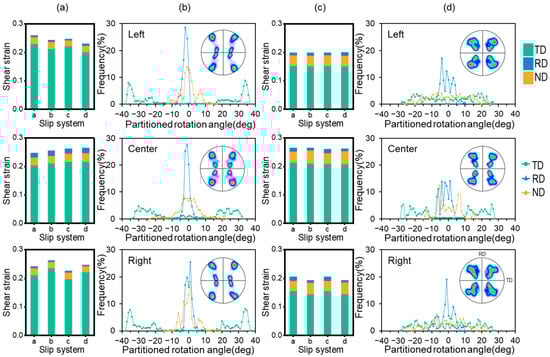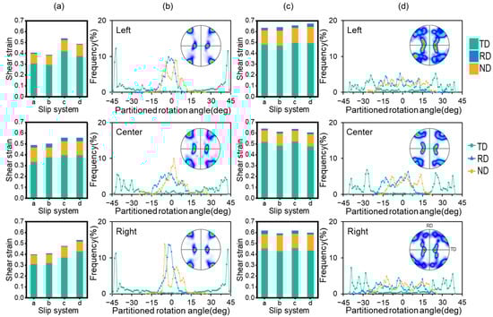 As shown in Figure 6, in the 3DR model, the crystal orientations undergo significant rotation in the left and right regions, while the central area remains relatively stable with minor changes. In contrast, the 3DRC model exhibits the opposite behavior with the central region experiencing a larger rotation angle compared to the edge regions. Additionally, Figure 6a,b show that the shear strain on the slip system in the left area is symmetric to that in the right area, resulting in symmetric pole figures and rotation angles. This phenomenon pattern is also observed in the 3DRC model, as illustrated in Figure 6c,d. By comparing different regions in the 3DR and 3DRC models, it is found that the pole figures of the center area in the 3DR model after 1-pass are similar to those of the edge area in the 3DRC model. This similarity is due to the fact that the center area of the 3DR model, constrained by the edge area, is equivalent to the 3DRC. Furthermore, non-TD rotations are observed at the early stage of rolling. This is due to the imbalance between the shear strains acting on the slip systems, which induces additional rotation angles. This phenomenon has been discussed in detail in Ref. [].