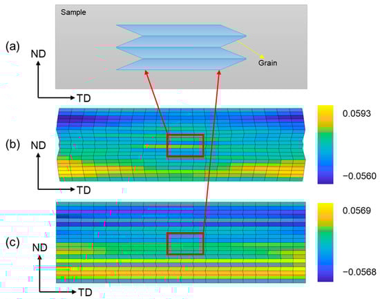 Since non-TD rotation increases with the degree of deviation from PS deformation [], the above analysis reveals that the non-TD rotation in the 3DRC model is significantly larger than in the 3DR model. This phenomenon indicates that the application of external constraints does not bring the rolling process closer to the PS condition. On the contrary, it drives the deformation further away from the ideal PS state. Additionally, this conclusion is supported by the observation that the sample with external constraints shows slight elongation along the TD in the experiment, whereas TD elongation is completely constrained in the simulation. These relatively stronger external constraints in the simulation result in a larger non-TD rotation compared to the experiment.