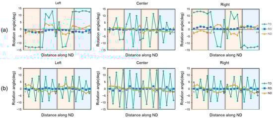 The rotation angle along the ND in 1-pass. (a) 3DR model, (b) 3DRC model.