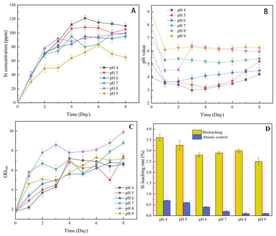 - Zhang, Q.; Liang, L.; Jing, M.; Yan, X.; Peng, Y. Bioleaching of available silicon from coal tailings using Bacillus mucilaginosus: A sustainable solution for soil improvement. Environ. Sci. Pollut. Res. 2023, 30, 93142–93154. [Google Scholar] [CrossRef]