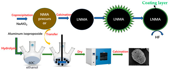 The spherical LiNi0.9Mn0.05Al0.05O2-layered materials were synthesized by solid-phase reaction using high-purity lithium hydroxide (LiOH, AR, Tianjin Kernel Co., Ltd.) and the above-synthesized NMA-x (x = 1–3). During the synthesis process, the materials were mixed in accordance with the molar ratio of LiOH to transition metal hydroxide precursor of 1.05:1; the mixture was mixed and it was ensured that both were well and evenly mixed. Subsequently, the mixture was first heated at 400 °C for 5 h. Then it was heated up to 800 °C in air at a heating rate of 5 °C/min and retained for 12 h. The formation of the Al2O3 coating was as in Reaction (2). The finally obtained cathode materials were labeled as LNMA-x (x = 1–3). The whole preparation process of the materials is shown in Figure 1 and this approach allows for a homogeneous coating layer.