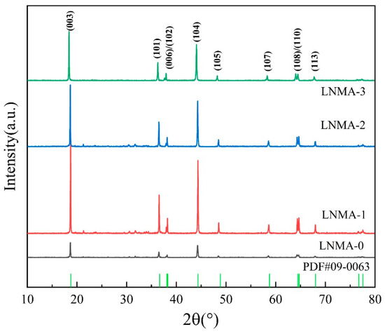 XRD patterns of the LNMA-0, LNMA-1, LNMA-2, LNMA-3 cathode materials.