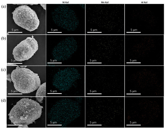 EDS mapping of cathode of (a) LNMA-0, (b) LNMA-1, (c) LNMA-2, (d) LNMA-3.
