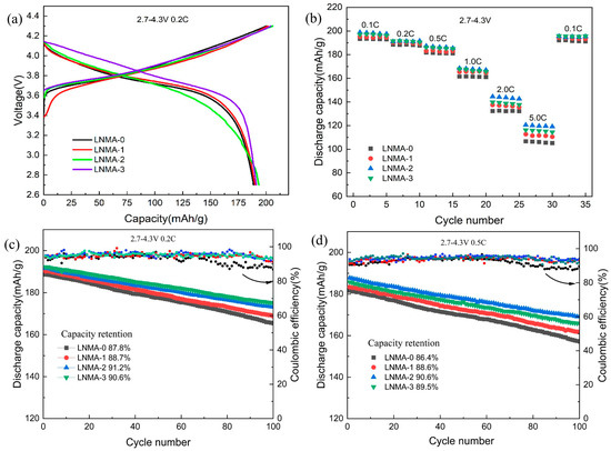 Figure 6a shows the initial charge/discharge curves of the samples at 0.2 C in 2.7–4.3 V. The charge/discharge voltage curves of all the samples are similar to those of the nickel-rich cathode materials, but the initial charge/discharge capacities are different. As shown in Figure 8a, the voltage profiles of all samples have a distinct oxidation peak at 3.9 V and a smaller reduction peak at 3.7 V. These peaks correspond to the Ni2+/Ni4+ redox pairs [42]. The initial charge capacities of LNMA-0 to LNMA-3 cathodes were determined as 199.4, 201.7, 204.5, and 203.7 mAh g−1, with corresponding discharge capacities of 187.1, 190.2, 193.5, and 191.7 mAh g−1, respectively. These values yield Coulombic efficiencies of 93.8%, 94.3%, 94.6%, and 94.1%. The results showed that the charging and discharging capabilities of LNMA cathode materials were first enhanced and then weakened with the increase in the amount of aluminum isopropoxide in the synthesis process. The increase in the specific capacity is related to the mixing and discharging degree of Li+/Ni2+ in the cathode material. At the same time, this characteristic parameter is not a decisive factor for the charge/discharge performance, and the migration path of lithium ions in the particles also affects the discharge process. Thick surface coatings also reduce the amount of active material to a certain extent, and therefore are not conducive to performance improvement.