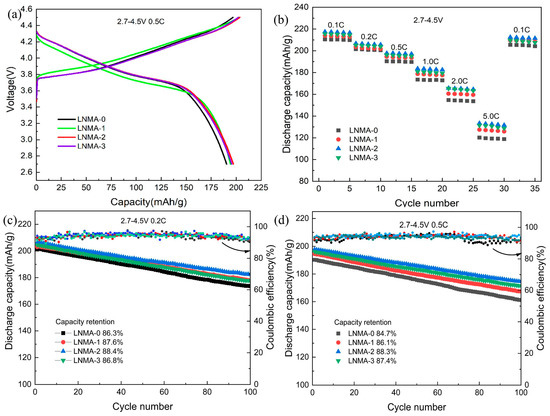 The electrochemical performance of LNMA cathode active materials, including (a) initial charge/discharge profiles at 0.5 C, (b) rate capability, and (c) cycling stability tested at 0.2 C and (d) 0.5 C, all measured within a voltage range of 2.7–4.5 V at room temperature.