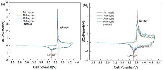 In order to study the evolution of the voltage profile during cycling, we analyzed the capacity difference (dQ/dV) profiles of LNMA-0 and LNMA-2 for the 1st, 10th, 20th, and 50th cycles at 0.5 C in the voltage range 2.7–4.3 V. For LNMA-0 (Figure 8a), the cathodic peak (corresponding to the Ni2+/Ni4+ redox pair) gradually shifted from 3.85 V to 3.87 V during cycling. Meanwhile, the anodic peak (corresponding to the Ni4+/Ni2+ redox pair) gradually shifted from about 3.71 V to 3.69 V. Compared with LNMA-2 (Figure 8b), the peak position of LNMA-2 remained essentially unchanged during the cycling process, and this significant voltage shift suggests that LNMA-0 underwent a larger electrochemical polarization during the cycling process. In addition, the anodic peak observed at 3.86 V weakened in intensity after the 50th cycle, which could be attributed to the degradation of the electrode/electrolyte interface and the occurrence of some side reactions. In contrast, the anodic peak of LNMA-2 (Figure 8b) shifted very little, indicating less electrochemical polarisation and also reflecting the excellent cycling stability mentioned above. The improved cycling stability is mainly attributed to the protective effect of the Al2O3-capping layer.