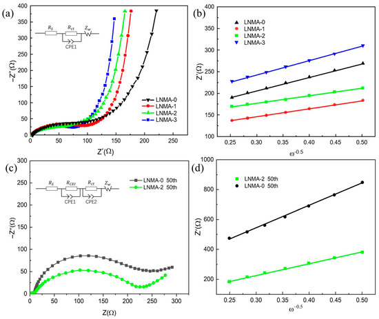 (a) Nyquist plots of as-prepared LNMA electrodes; (b) the relationships between Z′ and of as-prepared LNMA electrodes; (c) Nyquist plots of LNMA electrodes after 50th cycling; (d) the relationships between Z′ and after 50th cycling.