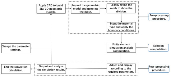 Using ABAQUS for finite element analysis mainly includes three steps: preprocessing, solution computation, and postprocessing. Among them, preprocessing is the key step of the entire simulation link, which is related to the efficiency of the simulation operation and even whether the simulation can be successfully carried out. The solution computation can complete the basic analysis of metal cutting in the simulation process and complete the analysis and calculation of stress–strain and system temperature fields as well as cutting force. The analysis results are saved in binary form for postprocessing. Postprocessing is a vivid and intuitive interpretation of the operation results, making the calculation results visualized. Its main functions are as follows: (1) displaying the material flow mode during the simulation process; (2) outputting the cloud images of the temperature field and the stress–strain field in deformation; (3) being able to output the force curve and temperature curve of each node. The specific simulation analysis process of ABAQUS is shown in Figure 1.