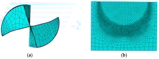 Finally, the tool and workpiece models with divided meshes are assembled together, and their relative positions are adjusted to ensure that they are in close proximity without interference. When defining the analysis steps, the longer the analysis step time is, the higher the calculation accuracy will be, but at the same time, the time used in the calculation process will also be longer. After comprehensive consideration in this paper, the analysis step time is set to 0.00125 s. The assembly diagram is shown in Figure 4.