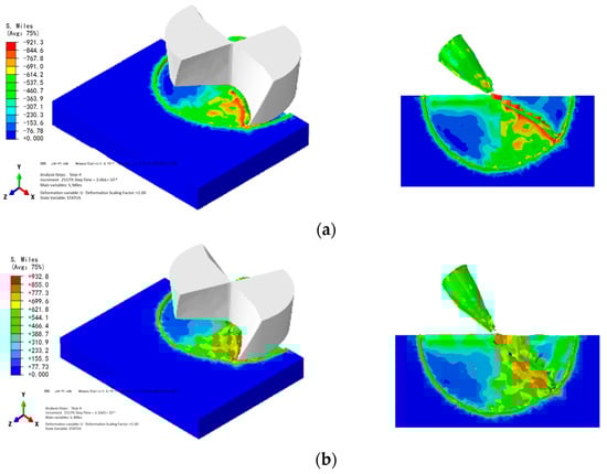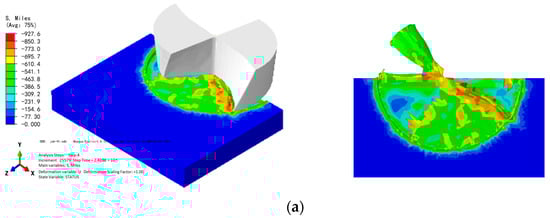It can be seen from the above simulation results that in the micro-milling process, the stress at the tool–workpiece contact area is always relatively high. And due to the anisotropy of the monocrystalline material DD5, at every moment in the micro-scale milling process, when the tool cuts different positions of the workpiece, there are differences in the stress distribution on the workpiece surface. From the stress nephogram in Figure 6, it can be seen that as the milling speed increases, the milling force tends to decrease; from the stress nephogram in Figure 7, it can be seen that as the milling depth increases, the milling force tends to increase.
