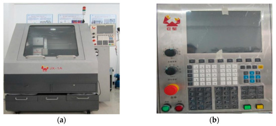 To ensure the smooth progress of the experiments, there are certain requirements for the technical specifications of the precision machine tools used in the machining. The technical parameters of the JX-1A Crab Precision Machining Center are shown in Table 3. It can be seen that this machine tool has high tool-positioning accuracy and a high milling speed, which can achieve sub-micron level machining accuracy and meet the experimental requirements. During the machining process, the workpiece being machined is adsorbed on a vacuum chuck and moves in the Y-coordinate direction along with the worktable to achieve feeding. At the same time, the pneumatic spindle drives the tool to rotate and move in the X and Z coordinate directions to machine the workpiece. During machining, the control panel on the machine tool is used to control the machining parameters. It is possible to choose manual operation to control the machine tool or to import a pre-written program into the machine tool for machining. Manual operation was chosen for all the experiments in this paper.