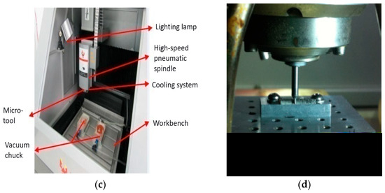 The precision machine tool of JX-1A. (a) Appearance drawing of machine tool. (b) Control panel. (c) Schematic diagram of the machining area’s structure. (d) Worktable and cutting tools.