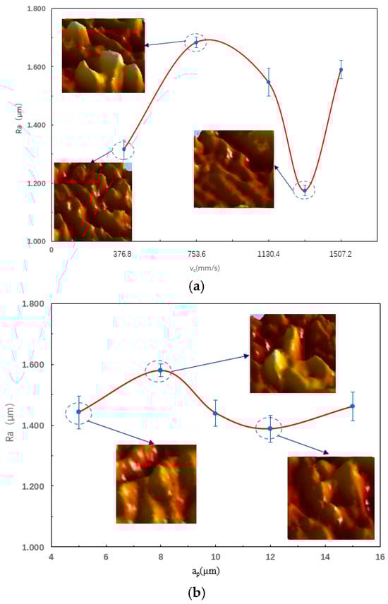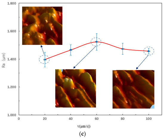 As can be seen from Figure 14, when the feed rate is constant, the surface quality of single-crystal DD5 varies with different cutting parameters. When the milling speed and milling depth gradually increase, the surface quality first becomes better and then worse. When the cutting parameters are relatively large, in addition to being affected by the machine tool spindle vibration, the burrs and microscopic defects on the surface produced during the machining process also have a certain impact on its surface quality.
