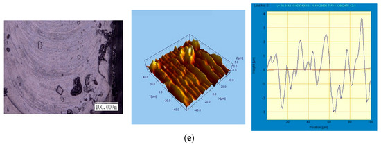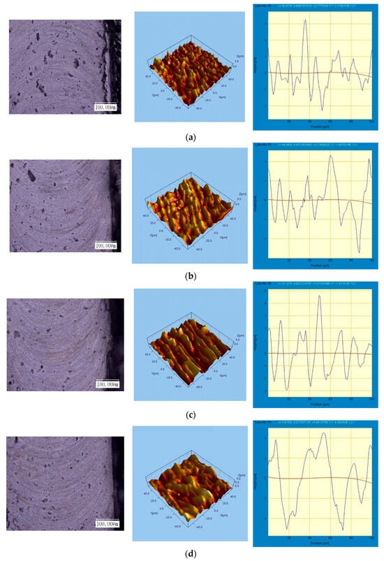 The three-dimensional profile and surface roughness are measured by the Micromeasure 3D Profilometer designed and manufactured by STIL Company in France. This equipment uses the scanning white light interference method to measure the surface roughness of the machined workpiece and generate a 3D profile morphology map of the workpiece. In the experiments of this paper, the selected sampling area is 0.1 mm × 0.1 mm, and a 50× laser lens is applied. During the measurement process, the lens does not contact the workpiece. The high-precision laser probe moves in the X and Y directions for scanning, and the scanning results are analyzed and processed by the supporting software to obtain the detection information such as the surface roughness and 3D profile morphology map of the surface under test.
