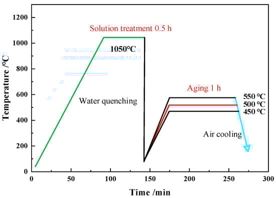 The test sample was prepared via the wire cutting mechanism. Specimens with dimensions of 150 mm × 22 mm × 40 mm were solution-treated at 1050 °C for 0.5 h and then water-quenched. After solution treatment, the specimens were aged at 450 °C, 500 °C, and 550 °C for 1 h, respectively. The processing diagram of the aging treatment of the specimens is as shown in Figure 1.