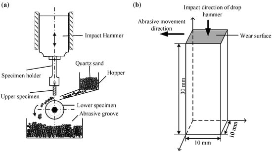 The impact wear tests were conducted with MLD-10 impact wear testing machine (Shandong Hongde Industrial Co., Ltd., Jining, China) (as shown in Figure 2a). The impact wear tests were performed under low-energy impact (2.0 J) and high-energy impact (5.0 J), respectively. The upper specimens were the investigated steels with dimensions of 10 mm × 10 mm × 30 mm (as shown in Figure 2b). Pre-grinding of the specimen before the wear test is 20 min, in order to eliminate the upper and lower specimens of the assembly error and other factors; after the end of the pre-grinding of the specimen, ultrasonic cleaning → drying → weighing was performed, marking the mass at this time for M0 (i.e., the official wear test of the initial mass). The specimen was removed every 20 min, cleaned, dried, and weighed once, and recorded as Mi (i = 1, 2, 3, 4). The difference between the initial weight M0 and Mi is considered to be the loss of weight of the specimen during a given wear time. To characterize the wear mechanism of high manganese steel, scanning electron microscope (SEM) was used to observe the wear morphology of the impacted abrasive wear specimens.