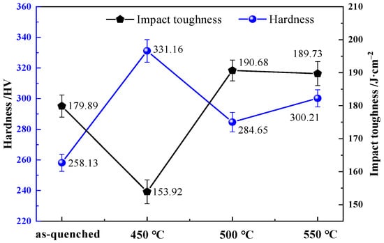 The effects of different aging temperatures on the hardness and impact toughness of Mn25 steel are shown in Figure 3. As can be seen in Figure 3, the surface hardness of Mn25 steel was improved after aging treatment. When the aging temperature is 400 °C, the surface hardness of Mn25 steel reaches the maximum value (331.16 HV), and then the surface hardness decreases with the aging temperature increase. And the impact toughness of Mn25 steel, with the aging temperature, at first sharply decreased and then increased. When the aging temperature continues to rise, the austenite matrix rises along with the crystal precipitation carbides, resulting in a reduction in the toughness of the Mn25 steel. At the aging temperature of 500 °C, the impact toughness performance of Mn25 steel reaches the maximum value, which is 199.68 J. When at the aging temperature of 450 °C, the impact toughness of Mn25 steel value is the smallest (153.92 J). When the aging temperature is 550 °C, the impact toughness and hardness match better. Comprehensive analysis, the purpose of aging treatment is to eliminate the internal stresses of Mn25 steel; the precipitation phase is uniformly dispersed precipitation in the matrix, which can improve the initial hardness of high manganese steel, while the toughness is not reduced [].