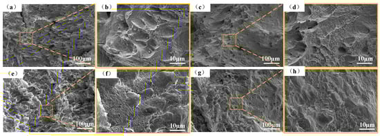 Morphologies of the impact fracture surface of Mn25 steel under different aging temperatures. (a,b) as-quenched, (c,d) 450 °C, (e,f) 500 °C, and (g,h) 550 °C.