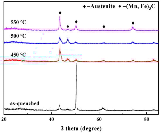 To further study the relationship between the composition of precipitates and their mechanical properties of high manganese steel after aging treatment, X-ray diffraction analysis was carried out on Mn25 steel after treatment at different aging temperatures, and the results are shown in Figure 5. The post-water-quenching treatment of the organization of Mn25 steel for austenite can be seen in Figure 5. When at the aging temperature of 450 °C, the matrix organization of Mn25 steel is still austenite, and at the same time the carbide (Mn, Fe)3C diffraction peak appeared, indicating the austenite precipitation of (Mn, Fe)3C carbides at this time. Subsequently, at the aging temperature of 500 °C, (Mn, Fe)3C carbide diffraction peaks gradually become weaker. When at the aging temperature of 550 °C, (Mn, Fe)3C carbide diffraction peaks gradually become stronger.