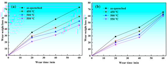 Figure 6 shows that the wear weight loss of Mn25 steel under different impact wear conditions. As shown in Figure 6a, in the low impact load (2.0 J) wear conditions, with the increase in aging temperature, wear loss of Mn25 steel was a decreasing trend. In addition, the wear loss of Mn25 steel at the aging temperature of 550 °C was significantly lower than the wear loss of Mn25 steel at an aging temperature of 450 °C and 500 °C; the abrasion resistance of Mn25 steel was the best. It can be seen in Figure 6b that when the wear conditions are in the high-impact load (5.0 J), the wear weight loss of Mn25 steel gradually decreases with the increase in aging temperature; while at aging temperatures of 450 °C and 500 °C, the wear weight loss of Mn25 steel is almost the same. When the aging temperature reaches up to 550 °C, a good combination of toughness and hardness exhibits in Mn25 steel that contributes to the superior impact wear resistance of Mn25 steel. It can be seen in Figure 6 that under high-impact load, the weight loss of high manganese steel without aging treatment is lower than that under low impact load; that is, the wear resistance of high manganese steel under high-impact load is higher than that under low impact load. The wear resistance of high manganese steel is greatly restricted by the working conditions. In high-impact contact abrasive wear, high manganese steel is easy to produce work hardening and improve wear resistance, and then it can reflect its wear characteristics [,,,,].