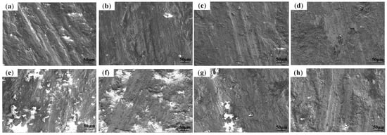 Figure 8a–h shows morphologies of the worn surface of Mn25 steel at different impact energies. It can be seen in Figure 8a that press-in particles and furrows could be observed on the wear surface of Mn25 under the low impact energy of 2.0 J. Owing to the fact that the hardness of M25 steel is relatively low, abrasive particles are embedded into the surface. As shown in Figure 8b–d, no obvious press-in particle could be found on the wear surface with the increase in aging treatment temperature. There are shallow cutting furrows on the surface, most of which are fatigue spalling, and the amount of spalling on the wear surface reduces when the temperature of the effect treatment is increased. When the impact energy increases up to 5 J, as shown in Figure 8e–h, a large number of abrasive particles are embedded into the surface. However, after the aging temperatures are higher than 500 °C, the press-in abrasive particles on the worn surface are significantly reduced, which is the result of high hardness and good work-hardening behavior. A hardening layer could be formed easily under the impact load. When the aging temperature is at 550 °C, the worn surface of Mn25 steel is smooth, and the wear resistance is better under both low and high-impact load. According to Figure 8, the wear mechanism of Mn25 steel under 2.0 J and 5.0 J impact-load wear conditions have plastic fatigue-spalling and micro-cutting at the same time; and, under low impact load of 2.0 J, the wear mechanism of Mn25 steel is mainly micro-cutting, and there are obvious directional cutting furrows. In high-impact load 5.0 J conditions, this time Mn25 steel mainly has a fatigue spalling wear mechanism. Ojala et al. found that work-hardening and mechanical performance have a significant effect on wear performance []. Comprehensive analysis, under the 2.0 J and 5.0 J impact work of abrasive wear conditions with the increase in aging temperature, is that, after wear 1 h the wear weight loss of Mn25 steel is smaller and its wear resistance is better. Under the 5.0 J impact power of abrasive wear conditions, the wear surface morphology of the Mn25 steel fatigue-spalling pit becomes shallower, indicating that the impact abrasive wear resistance of Mn25 steel is better.