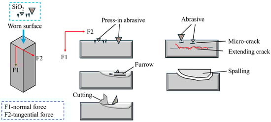 For the abrasive wear behavior, the wear morphology is often caused by the joint action of a variety of mechanisms []. Based on the above results, the wear model of the experimental steel under impact wear conditions is summarized, and its schematic diagram is shown in Figure 9. In the process of impact wear, the specimen is mainly subjected to tangential and normal forces from abrasive particles. For the tangential force, furrows easily appear on the surface with high plasticity, and a surface with low plasticity and high hardness is easy to be micro-cut to produce chips. For the normal force, it mainly comes from the impact stress generated when the hammer falls, which, on the one hand, causes the abrasive particles to embed into the surface and form the crack source. On the other hand, due to the continuous impact, such repeated plastic deformation eventually led to the peeling of the material, which became debris.