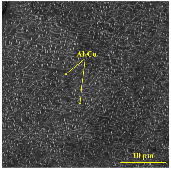 A scanning electron microscopy (SEM) image of Al-2Cu after heat treatment is presented in Figure 1. The microstructure was composed of needle-shaped Al2Cu phases in the aluminum matrix [18,19].