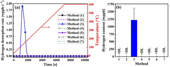 It is important to note that method 6 is applicable only to samples free from adherent corrosion products or surface damage such as pits. Samples with these defects require grinding before TDA. To simulate this condition, samples subjected to wet grinding were evaluated after a combined electrochemical polishing and chemical pickling process (method 7). The electrochemical polishing step was included to rapidly dissolve the surface layer to achieve a smooth surface. The samples treated by this combined approach showed hydrogen levels below the detection limit.