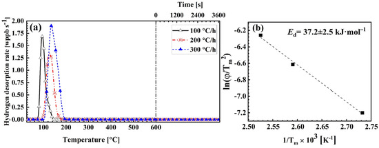 The hydrogen content was evaluated by a Bruker G8 GALILEO TDA analyzer (Billerica, MA, USA) with detection limit of 120 ppb, calculated based on calibration points and weight of the samples. Spectra were obtained by heating a specimen from 30 °C to 600 °C at a constant heating rate of 300 °C·h−1 followed by isothermal heating at 600 °C until full degassing. Additionally, the desorption energy Ed of trap sites was calculated by heating from 30 °C to 600 °C at three different heating rates of 100, 200, and 300 °C·h−1. Subsequently, the desorption energy was estimated in accordance with the Kissinger method, based on the shift of the peak temperature at different heating rates, using Equation (1) [17]: