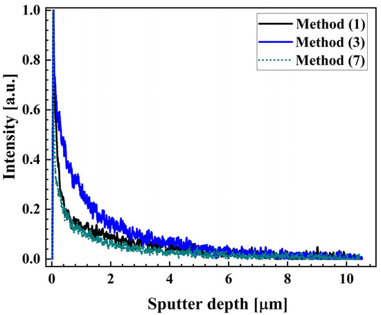 The absence of detectable hydrogen after the removal of a 10 µm thick layer, calculated based on mass loss, from the wet-ground samples (method 3), using a combination of electrochemical polishing and chemical pickling suggests that the hydrogen originated from the subsurface region at the micrometer scale. To verify this, GDOES was used to measure hydrogen profiles of samples prepared by degreasing with acetone (method 1), grinding in water (method 3), and grinding in water followed by chemical and electrochemical treatments (method 7), see Figure 4. As shown, signals for the unground sample and the sample subjected to combined electrochemical polishing and chemical pickling after grinding are similar, and decreased significantly faster compared to that of the sample treated with a single-step water grinding. This suggests the presence of a hydrogen-containing surface layer on the wet-ground sample, estimated to be less than 3 µm thick, based on the final crater depth. The post-grinding treatment of method 7 effectively removed this layer.