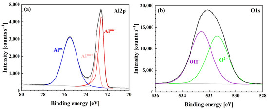The composition of the subsurface layer on the wet-ground sample was analyzed by XPS. Based on the aluminum and oxygen spectra shown in Figure 5a,b, Al2O3 and Al(OH)3 compounds were present on the surface.