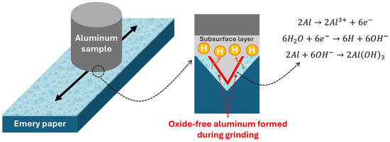 In reaction (5), atomic hydrogen can be produced with a stoichiometric ratio of 3:1 with aluminum oxidized to Al(OH)3. Subsequently, in the absence of the oxide film, the produced atomic hydrogen can diffuse into the sample [29], and it can become entrapped near the surface at trap sites such as lattice interstices, vacancies, dislocations, precipitates, high-angle grain boundaries, precipitates, solute atoms, second-phase particles, and micropores [7,21,30]. This mechanism is schematically illustrated in Figure 6, where oxide removal during wet grinding exposes bare aluminum, enabling hydrogen entry into the subsurface region.