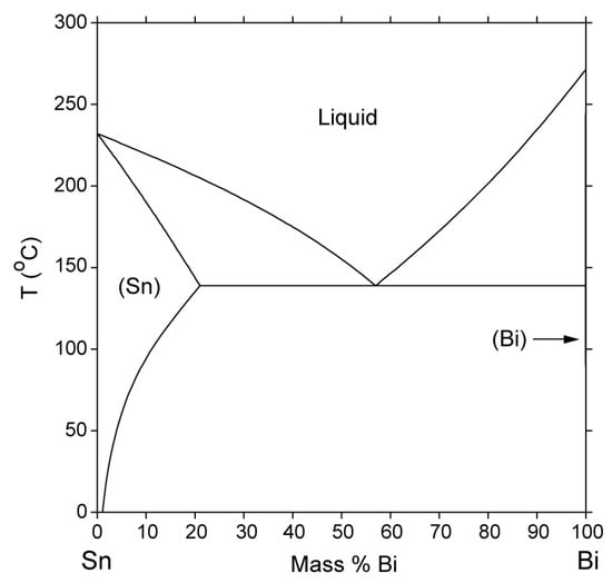 Among the promising candidates are bismuth-tin (Bi-Sn) based solders. Bi-Sn alloys have attracted attention due to their relatively low melting points, good wetting behavior, and reduced toxicity. According to the phase diagram in Figure 1 [], the eutectic Bi57Sn43 composition melts at approximately 139 °C, making it suitable for low-temperature soldering applications involving temperature-sensitive components and substrates [,,]. These properties make Bi-Sn alloys particularly well suited for use in flexible electronics, surface–mount technologies, and reworkable interconnects in multilayered or polymer-based printed circuit boards (PCBs) []. Additionally, Bi-Sn alloys exhibit low shrinkage during solidification, relatively stable thermal expansion behavior, and minimal intermetallic compound (IMC) formation when compared to other lead-free systems [,].